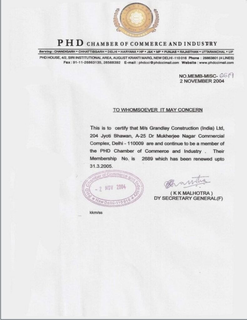 Grandlay Construction (India) Limited is proudly registered and accredited with some of the most respected industry bodies, including the PHD Chamber of Commerce, the Overseas Construction Council of India, and the Engineering Export Promotion Council of India. These certifications reflect our long-standing credibility, adherence to global construction standards, and our capability to execute large-scale civil and infrastructure projects across India and multiple international markets.